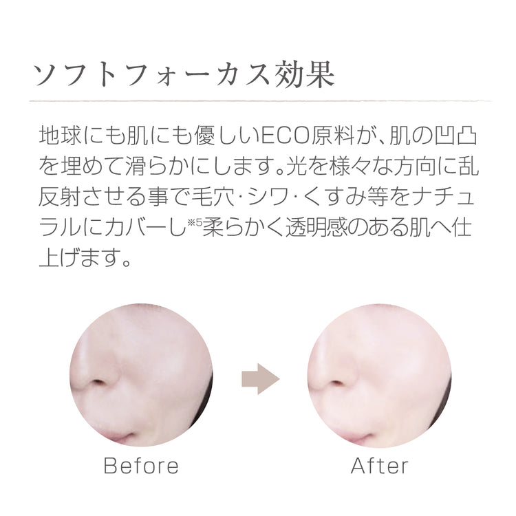 地球にも肌にも優しいECO原料が、肌の凸凹を埋めて滑らかにします。光を様々な方向に散乱させることで、毛穴・シワ・くすみ等をナチュラルカバーし※柔らかく透明感のある肌に仕上げます。