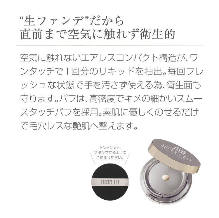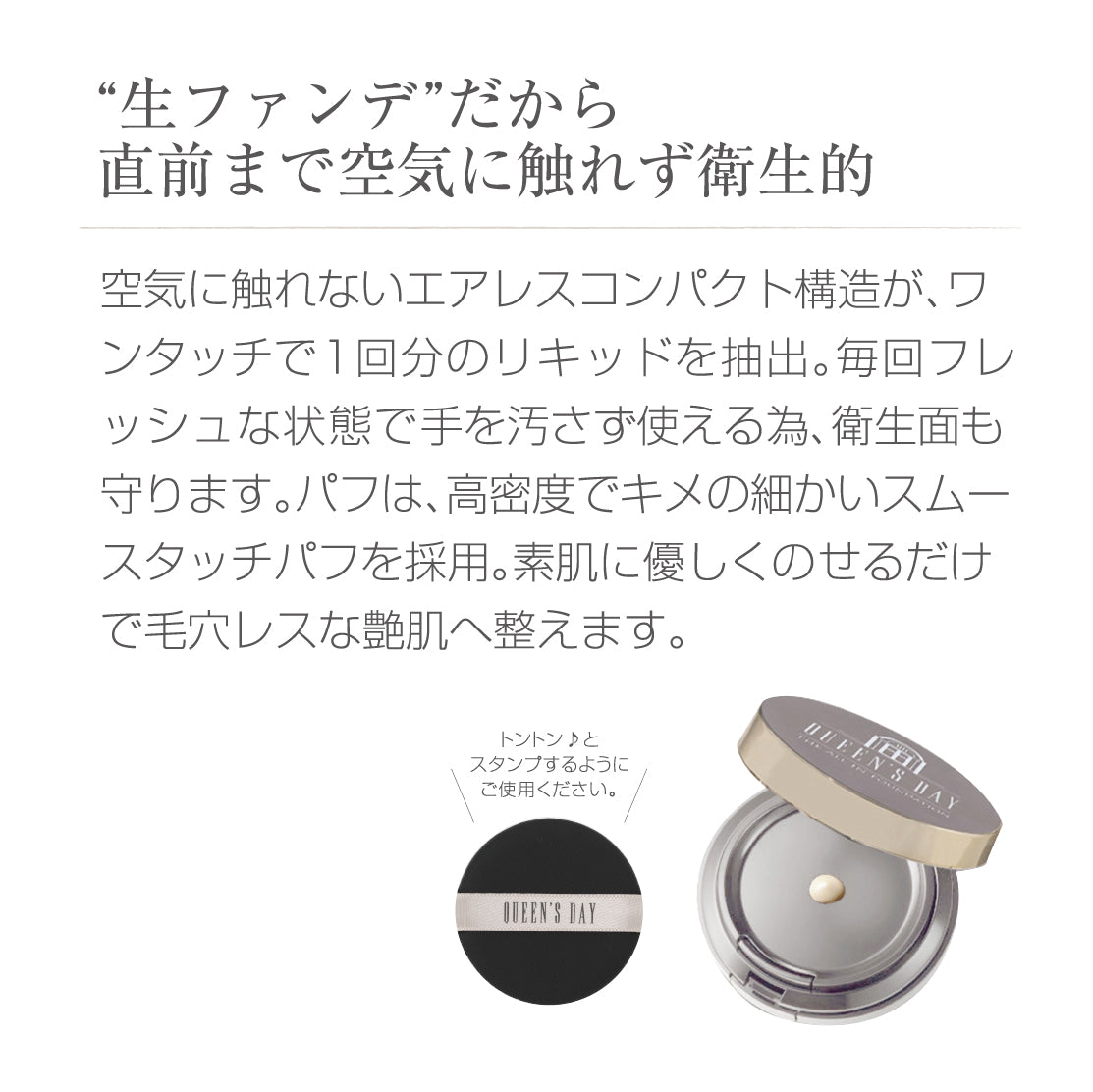 使用直前まで空気に触れないエアレスコンパクト構造がワンタッチで1回分のリキッドを抽出。毎回フレッシュな状態で手を汚さず使える為、衛生面を守ります。パフは、高密度でキメの細かいスムースタッチパフを採用。
