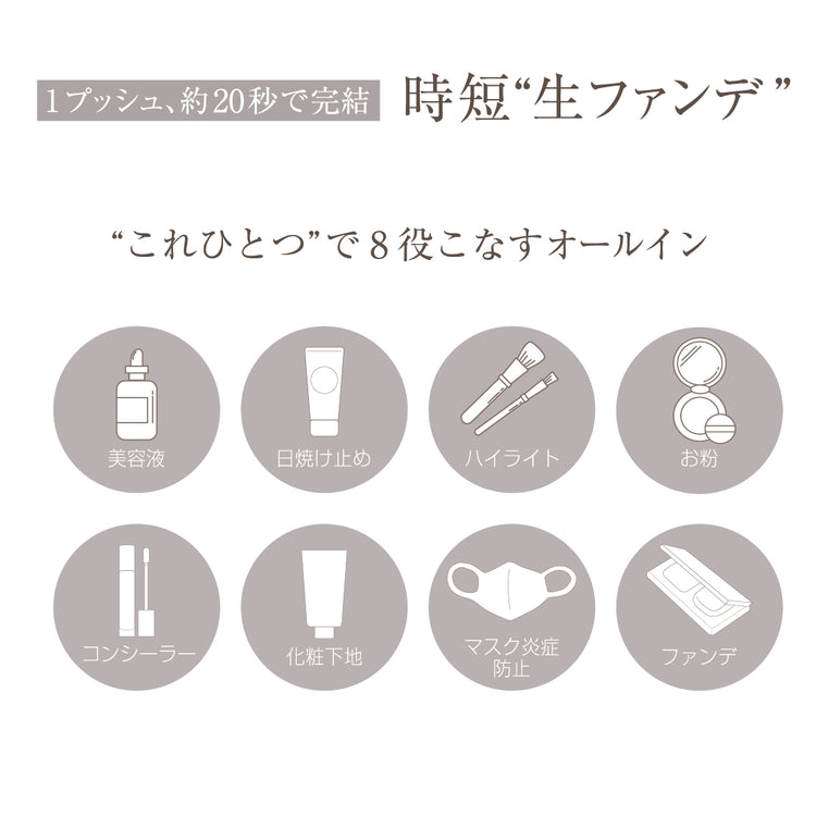 美容液、日焼け止め、ハイライト、お粉、コンシーラー、化粧下地、マスク炎症防止、ファンデの役を担ってくれる、忙しい女性に嬉しい時短コスメ。